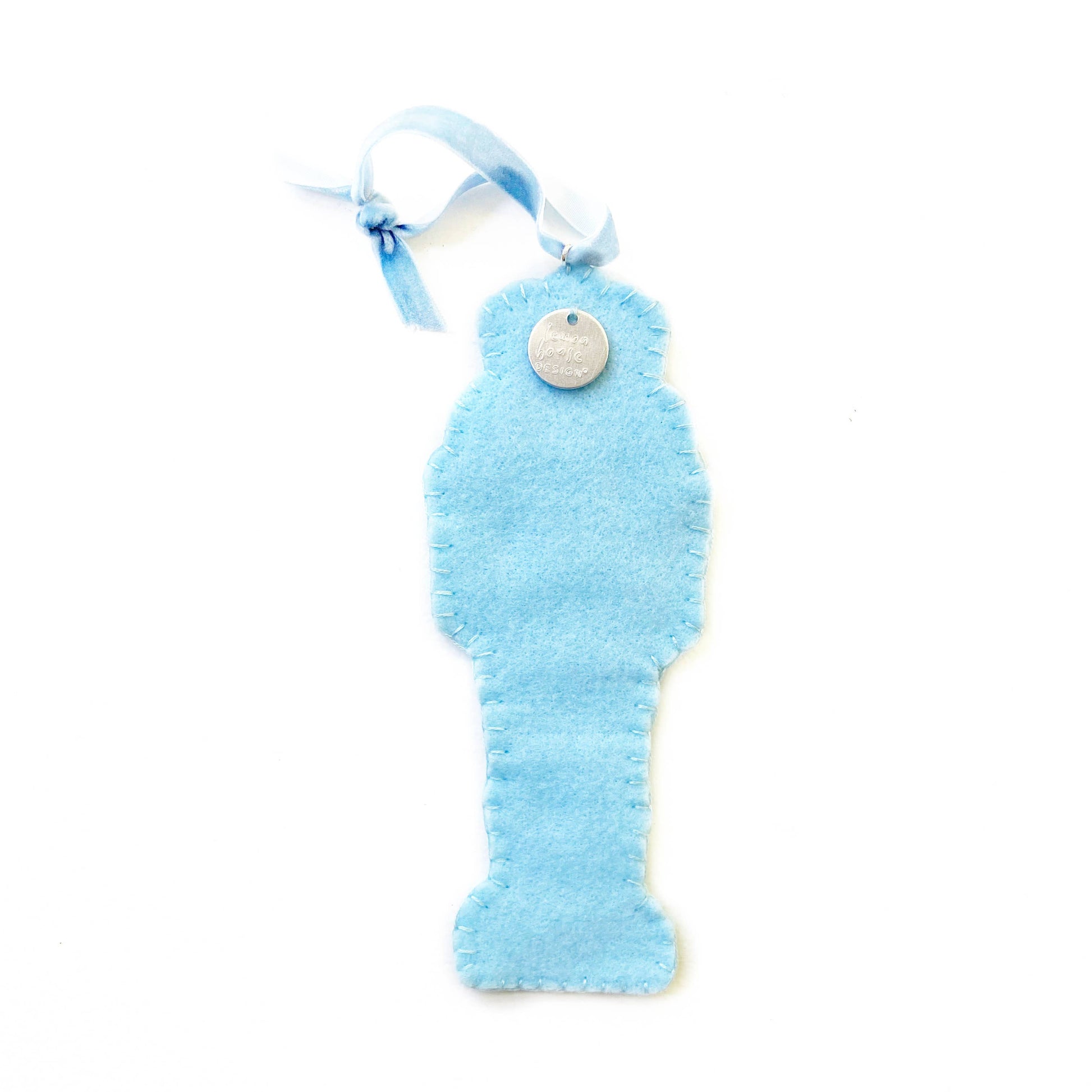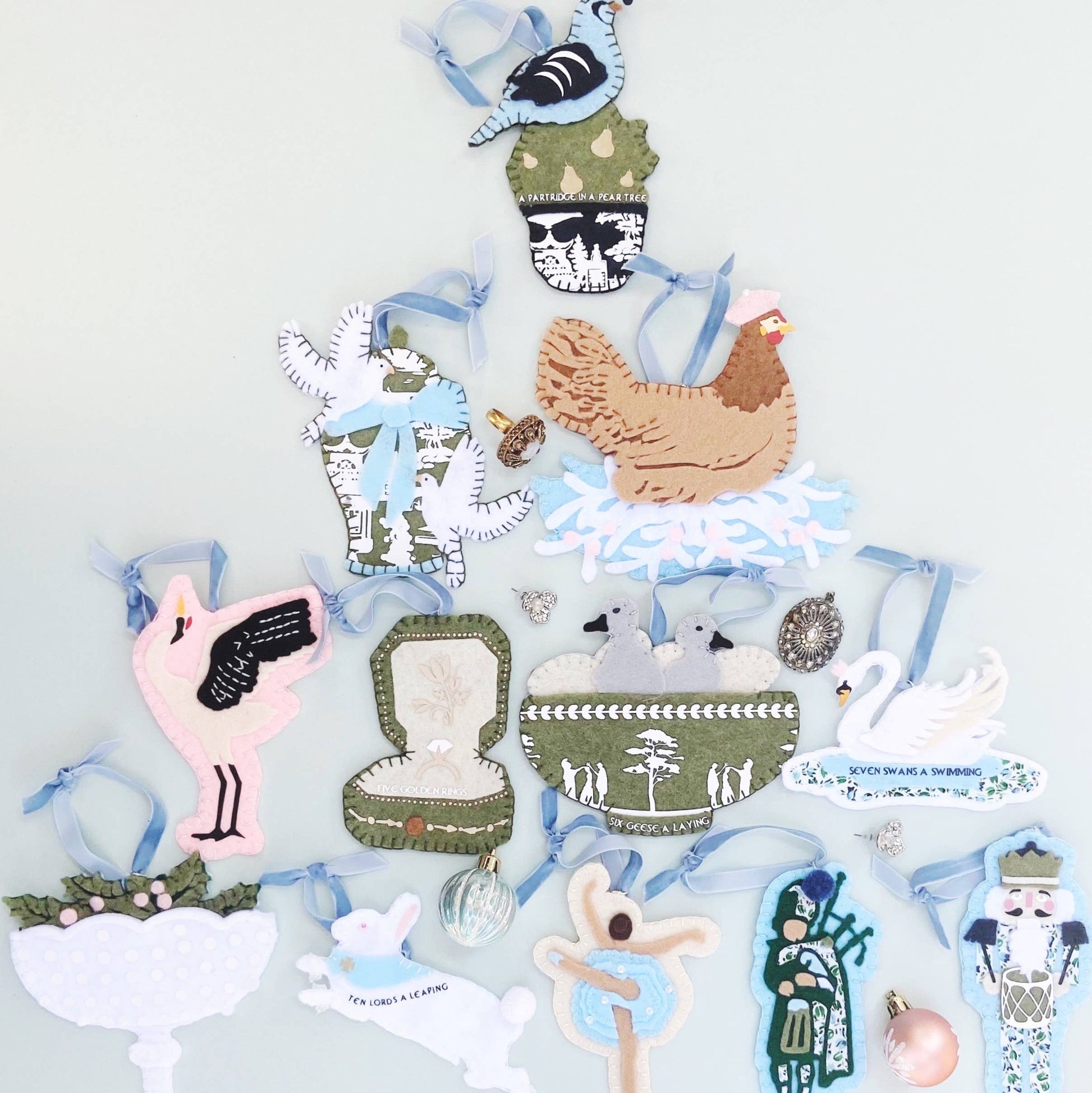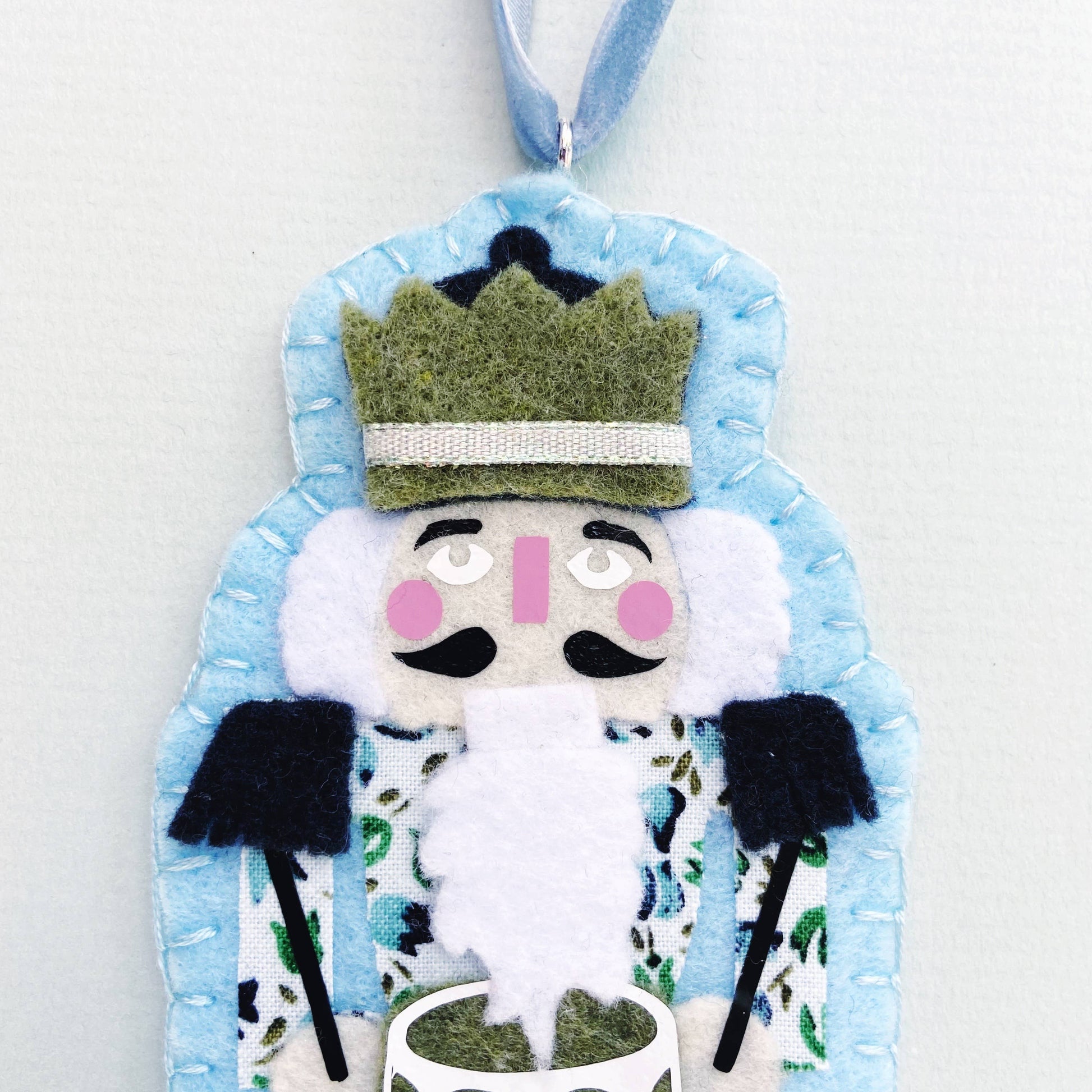 Complete your 12 Days of Christmas ornament set with this darling drumming nutcracker! Hand sewn from felt, a nutcracker never looked so dashing with his adorable floral pajamas and navy blue fringed epaulettes. Velvet ribbon loop makes for easy hanging.