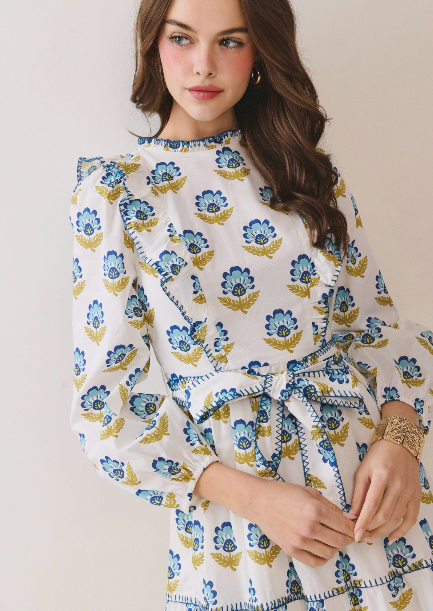 A floral-print mini dress featuring a round neckline and long sleeves. Designed with delicate ruffle accents along the front and shoulders. Includes a removable self-tie belt to define the waist and a tiered, flared skirt for added movement. Finished with contrast stitch detailing and a back keyhole closure.