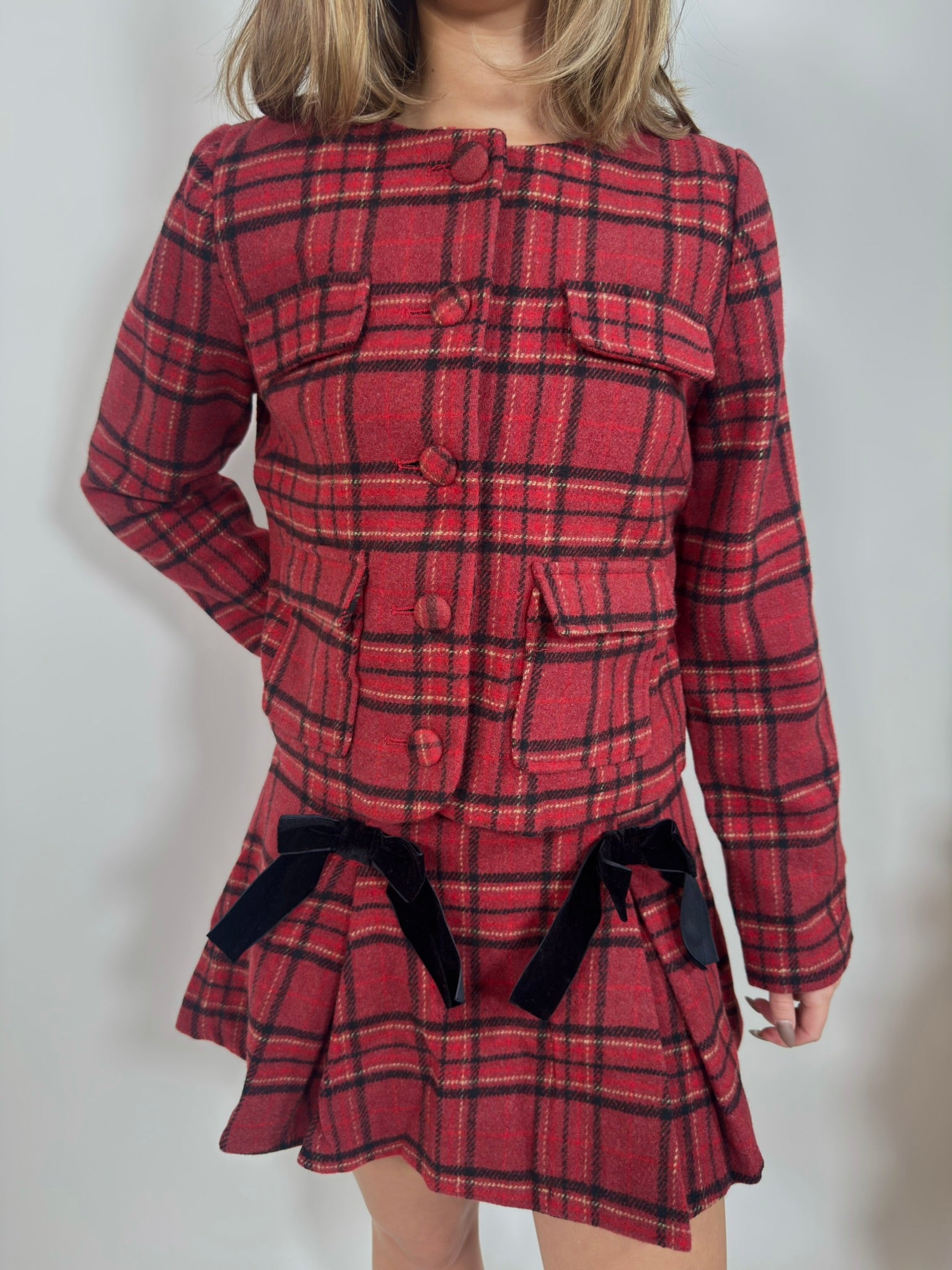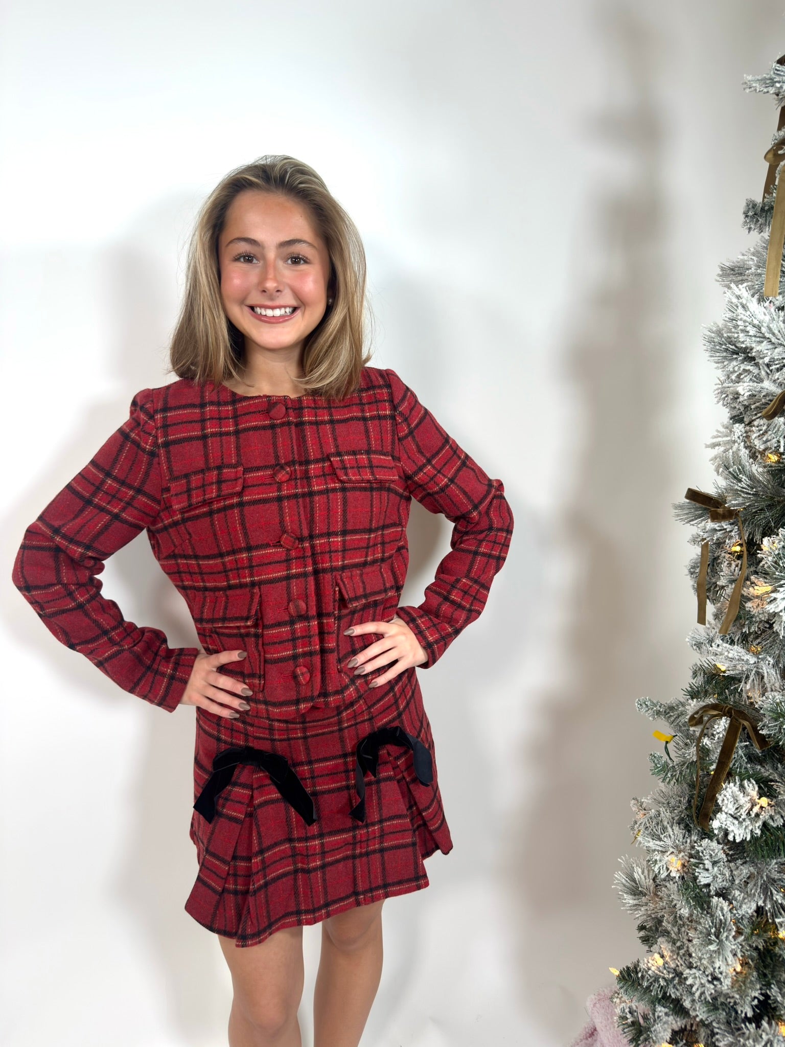 Elevate your holiday wardrobe with this charming Set, featuring a sophisticated round neck button-down jacket adorned with plaid pocket details and a coordinating pleated mini skirt accented with a velvet bow tie. Perfect for festive gatherings and seasonal celebrations, this coordinated ensemble captures timeless elegance with a modern twist. The classic plaid pattern brings warmth and tradition to your Christmas look, while the refined tailoring ensures you'll feel polished and put-together. Ideal for holiday parties, family photos, or special winter occasions.