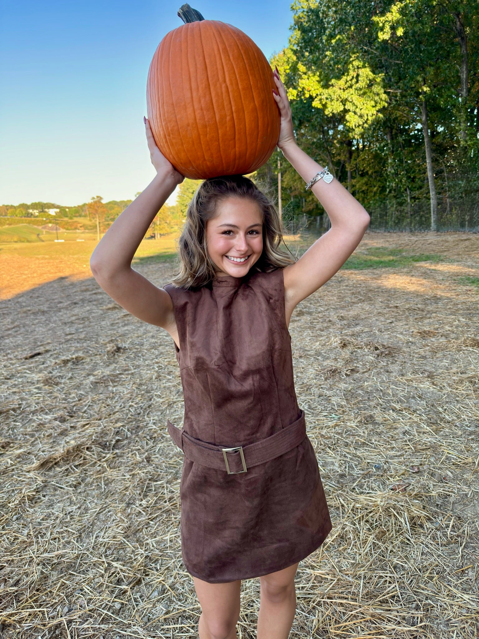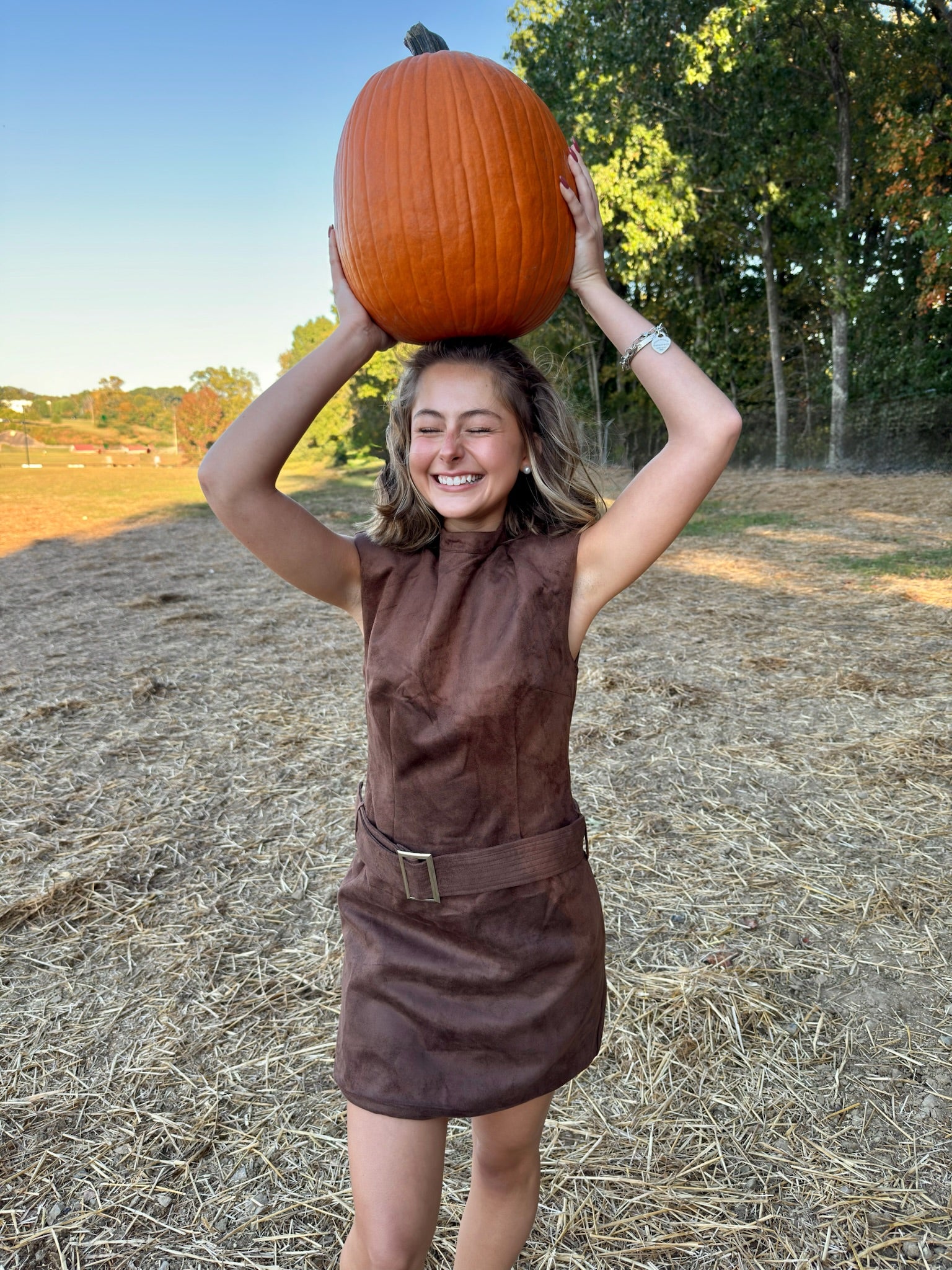Embrace effortless style with the Espresso Martini Dress, a sleeveless mini crafted in soft brown suede. Its warm, cozy texture pairs perfectly with the adjustable belt that cinches the waist for a flattering fit. Ideal for casual outings or relaxed evenings, this dress combines comfort and chic in one versatile piece.