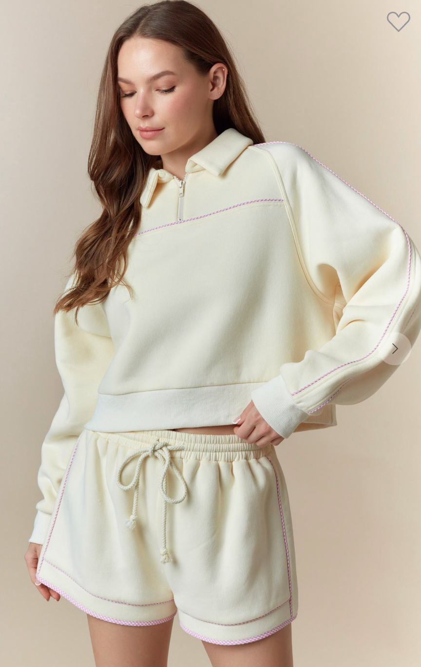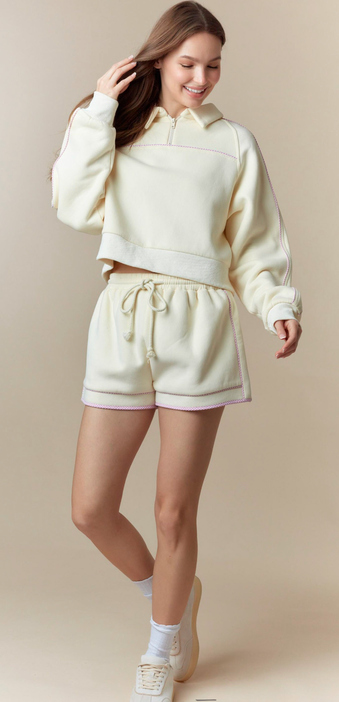 Enjoy comfort and style with the Gingham Cozy Set, featuring a creamy off-white two-piece design accented by playful pink and white gingham piping. The elastic waist shorts offer a perfect fit for easy movement, while the 3/4 zip top adds a sporty touch. This set is your go-to for relaxed days with a fun, fresh vibe.