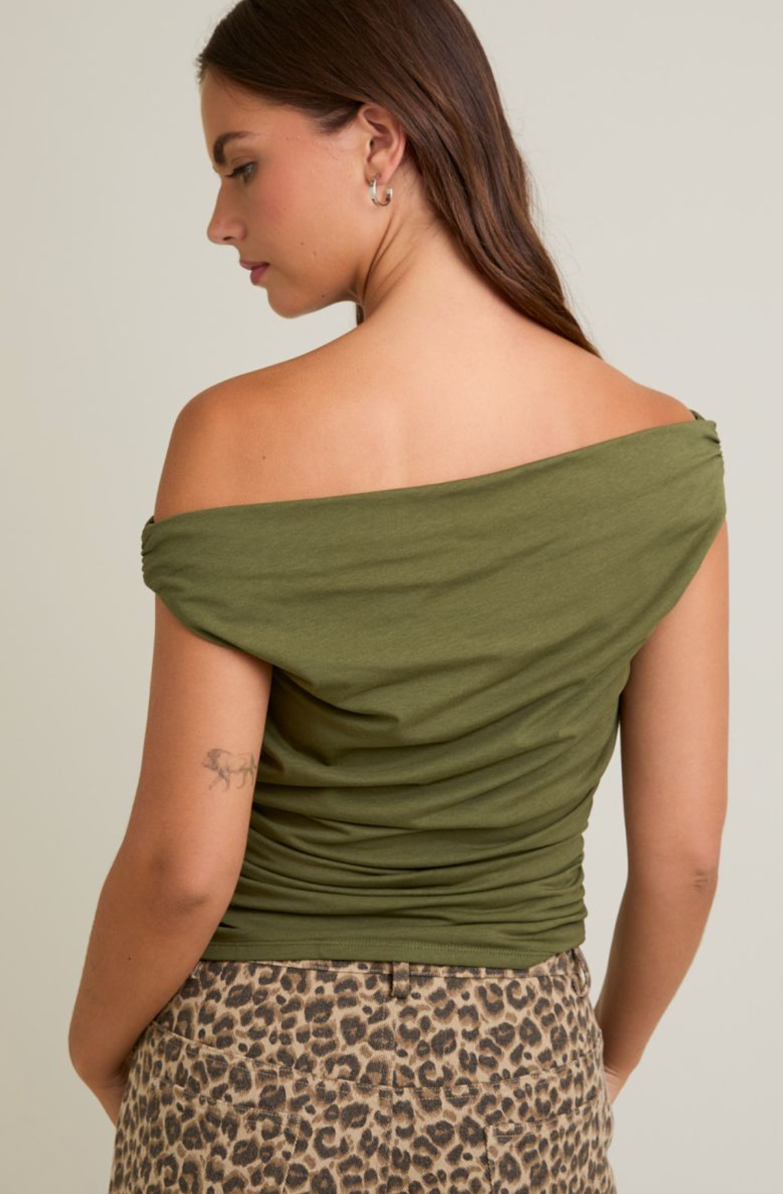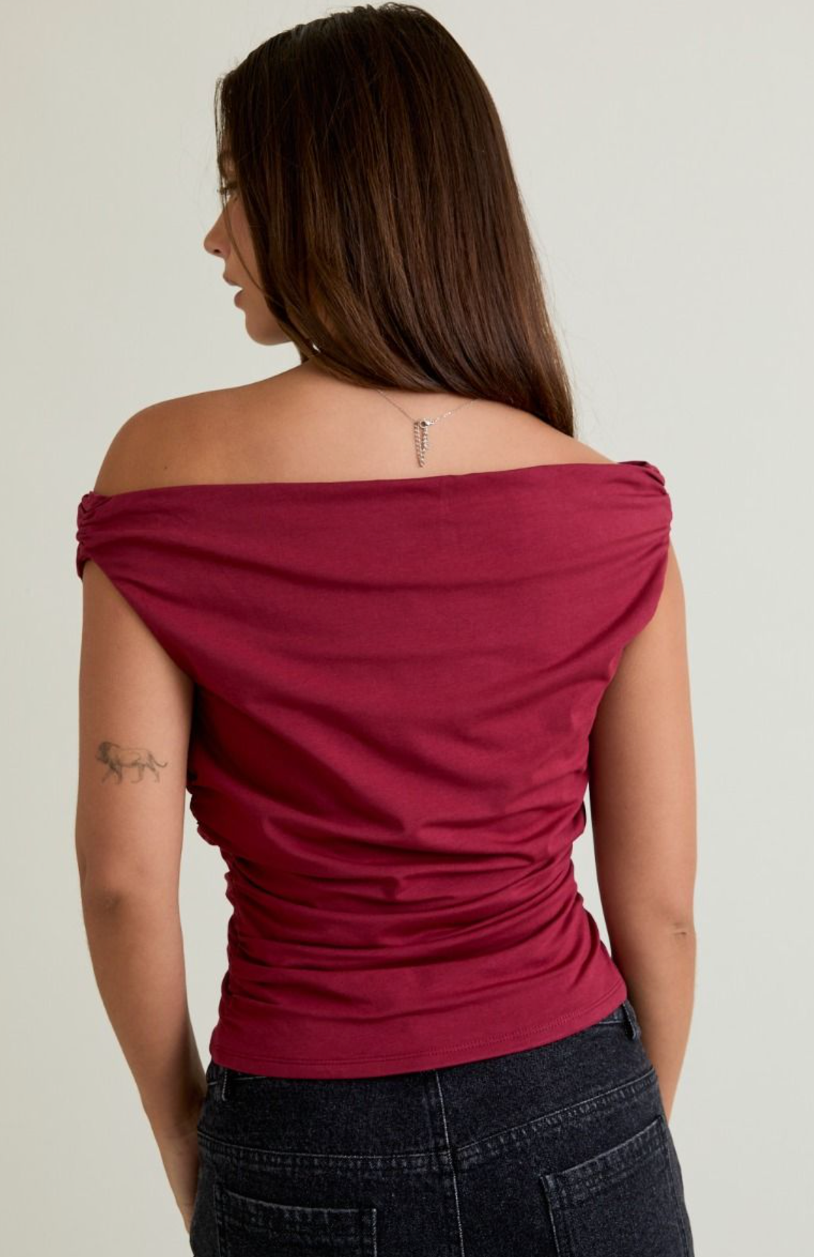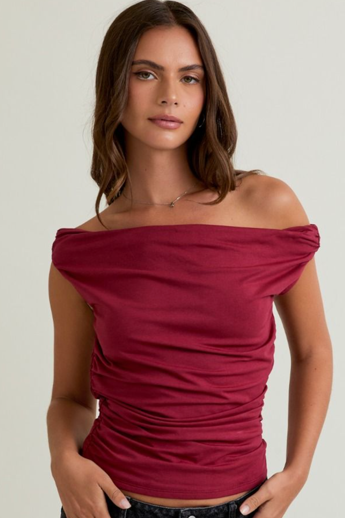 This off-the-shoulder top features delicate ruching that adds texture and a flattering fit perfect for fall. Its elegant neckline highlights your shoulders while providing a cozy option for transitional weather. Pair it with your favorite jeans or skirts for an effortlessly chic autumn look.
