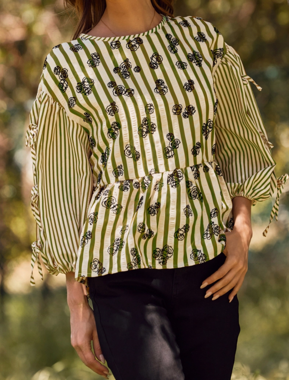 Olive Flocked floral printed striped peplum top with 3/4" sleeve with tie detail.