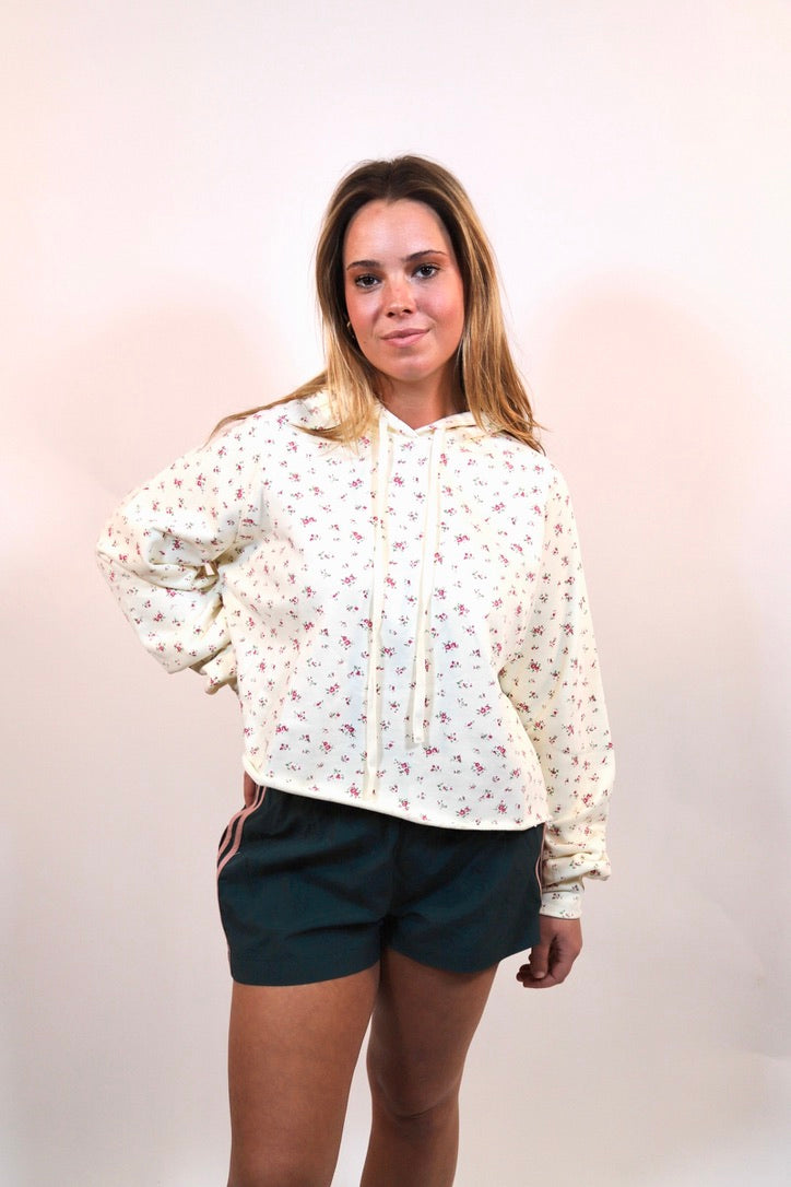 Elevate your garden party style with our Peony Pullover. Featuring a delicate floral print, raw hemline, and a slightly cropped fit, this hoodie adds a touch of sophistication to any casual look. Perfect for garden gatherings or just a cozy day at home. Paired with our Katie Shorts in Green for the complete transitional look.