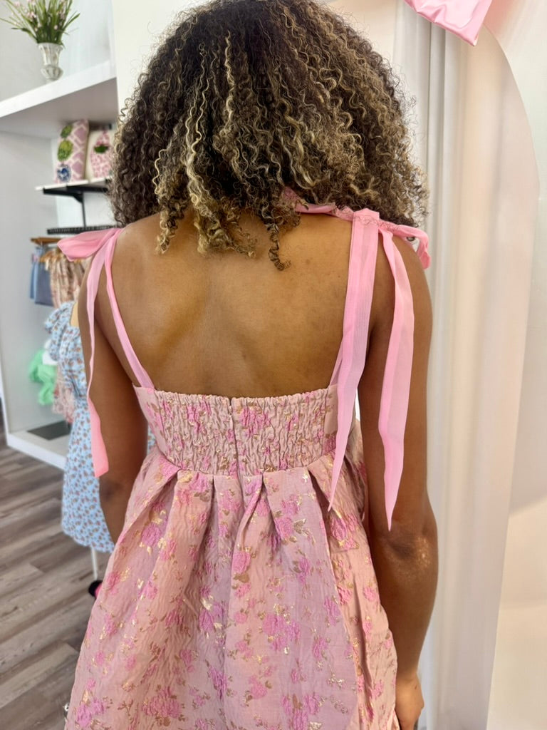 Step into sorority recruitment season with the Lila Dress, a charming pink jacquard mini dress featuring delicate pleats and trendy tie shoulder details. This playful yet polished look is perfect for making a memorable first impression, combining feminine flair with effortless style. Its flattering silhouette ensures confidence and comfort throughout your busy day of events. Elevate your recruitment wardrobe with this standout piece that balances sweet sophistication and youthful energy.