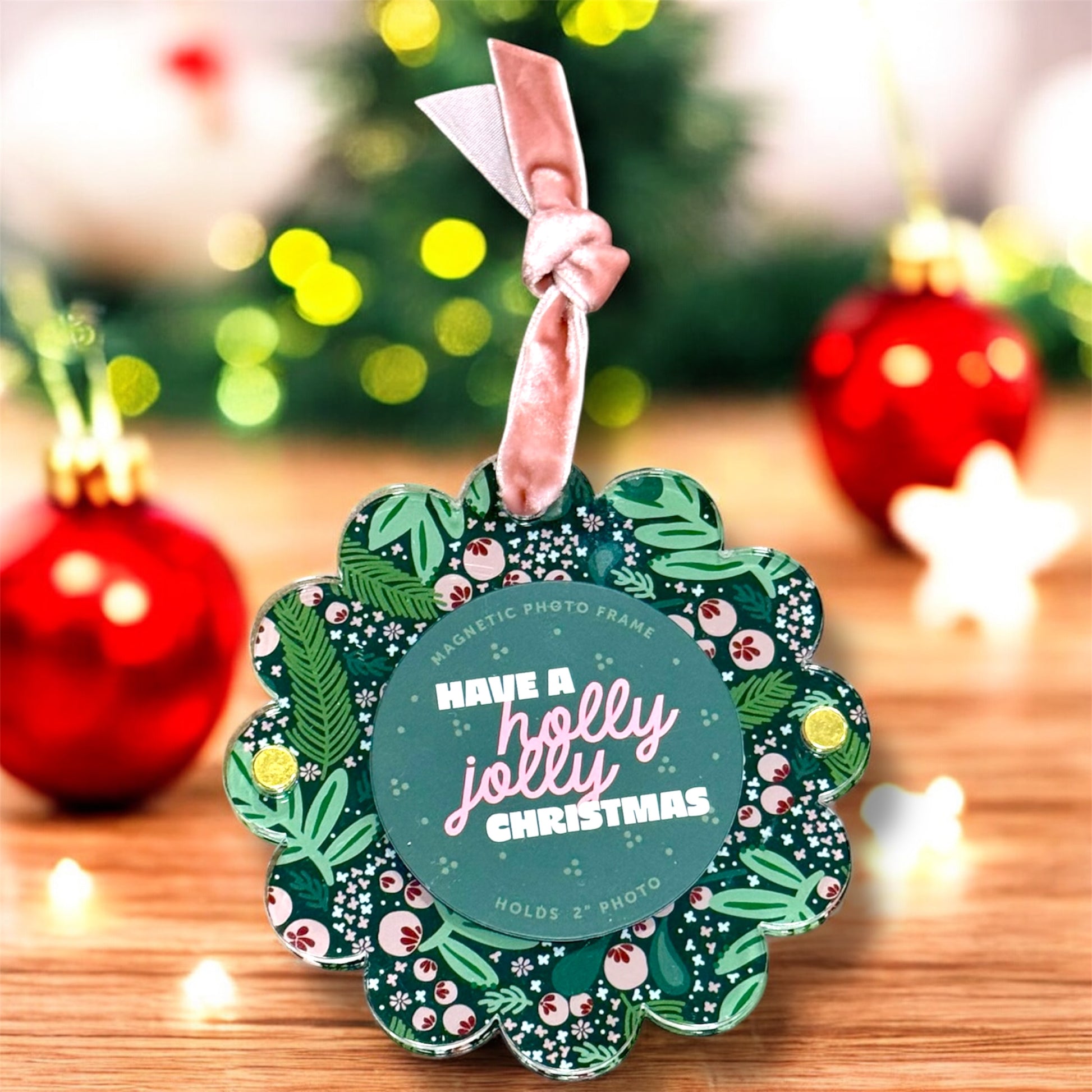 Add a personal touch to your holiday with our Scalloped Round Picture Frame Ornament! This modern hybrid design combines the charm of our festive acrylic ornaments with the function of our acrylic picture frames. A scalloped acrylic edge gives it a sleek, playful look, while the magnetic panels let you easily swap in your favorite 2" x 2" photos. Hang it on your tree or tie it to a gift using the included ribbon.