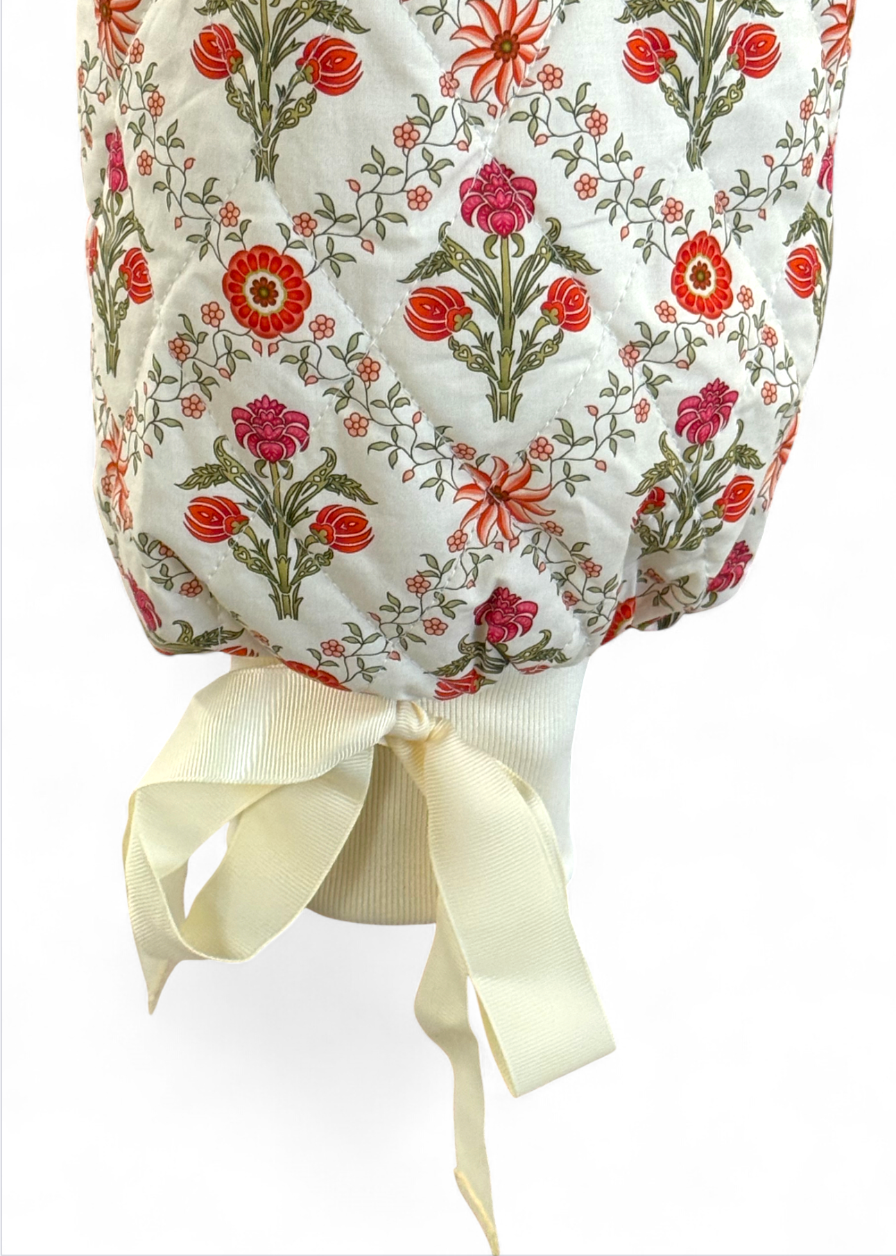 This floral quilted jacket offers cozy warmth with stylish details. Featuring a stand collar and snap button closure, it keeps you comfortably snug. The contrast binding trim and drop shoulder balloon sleeves with tying ribbon cuffs add unique charm. Practical patch pockets and a lined interior complete this cozy, elegant layer perfect for cooler days.