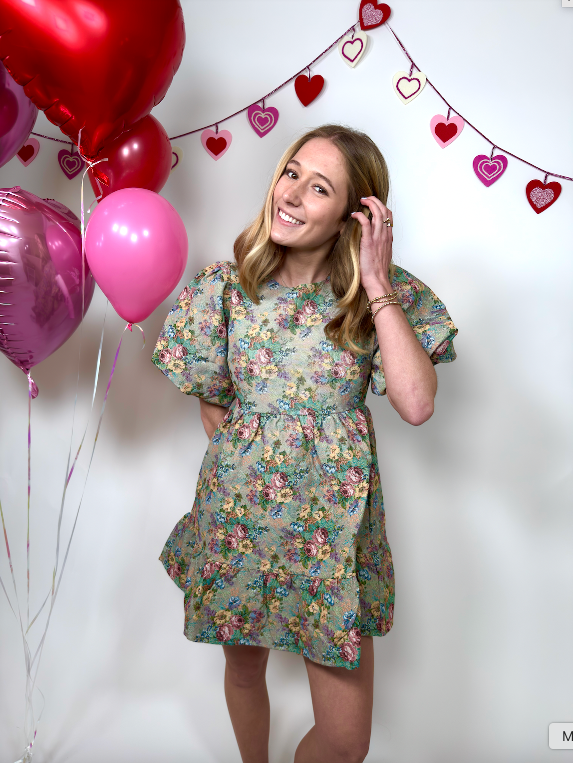 Elevate your wardrobe with this enchanting floral jacquard mini dress. Crafted from soft, luxurious fabric, it features delicate puff sleeves and a refined round neckline that captures the essence of contemporary soft girl aesthetics. The back zipper closure ensures a polished fit, while the charming ruffled hem adds an unexpected touch of whimsy.