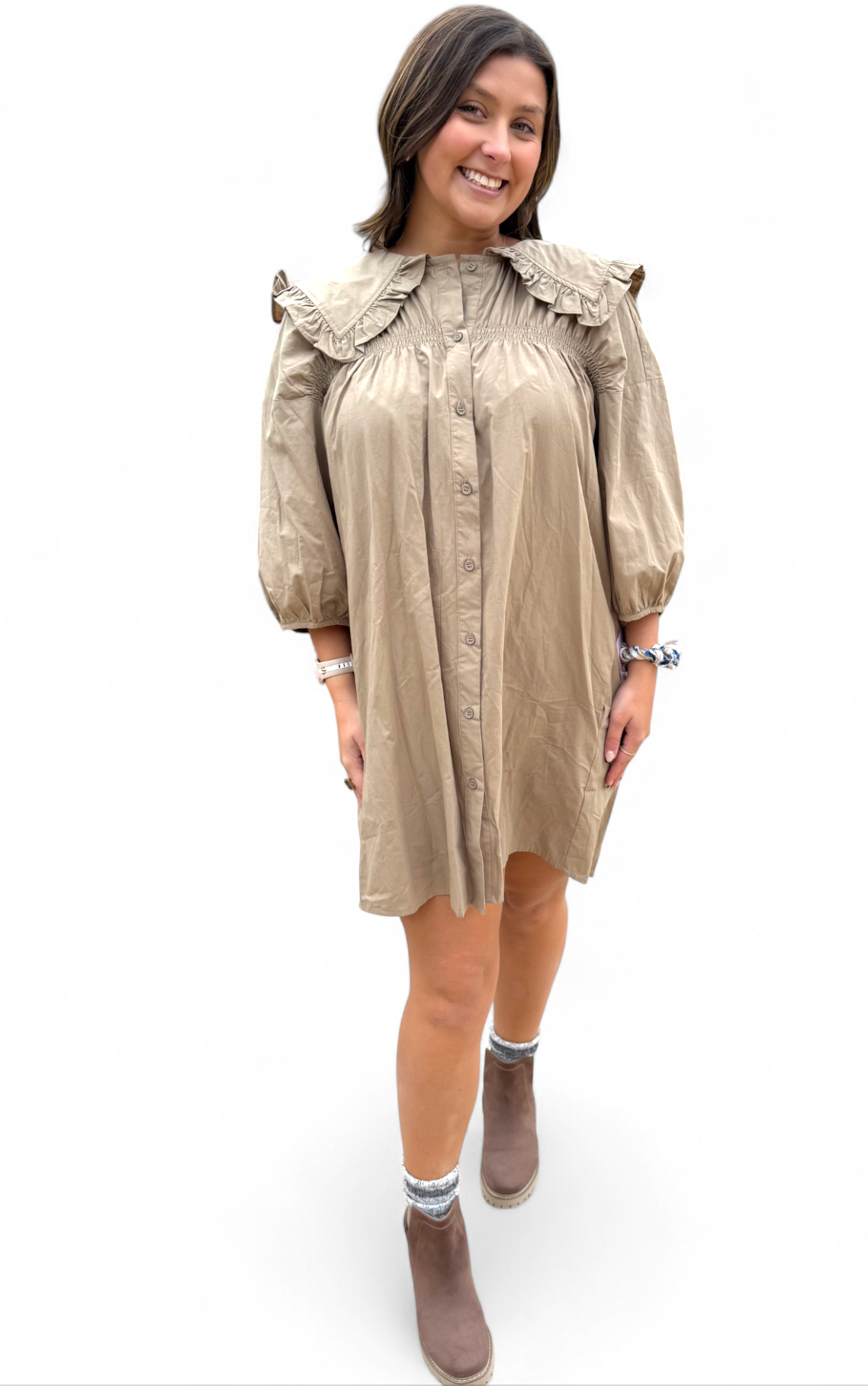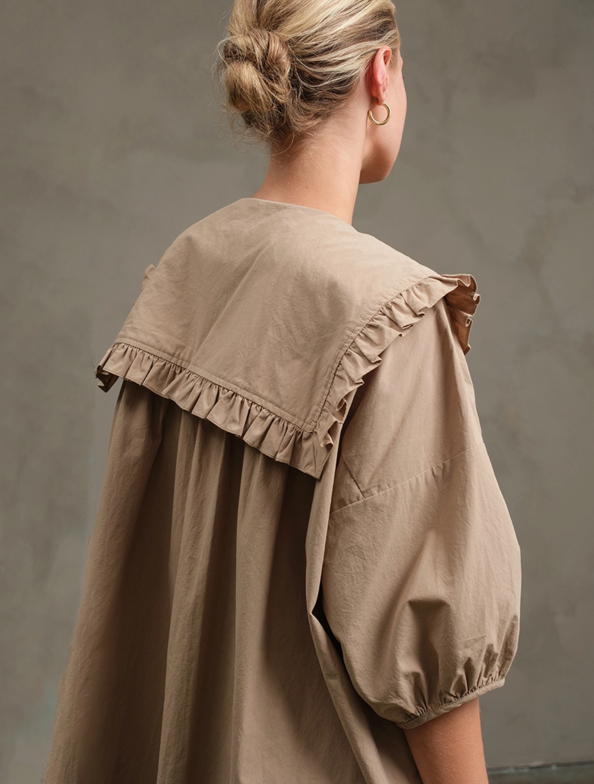 Made from crisp cotton fabric, it features roomy puff sleeves with elastic cuffs and a relaxed A-line shape that flatters all body types. The full front button closure adds practicality while maintaining a clean, minimal look—perfect for layering or wearing on its own. -Oversized ruffle collar -Front button-down closure -Puff sleeves with binding hem -Side pockets -Unlined / Non-sheer