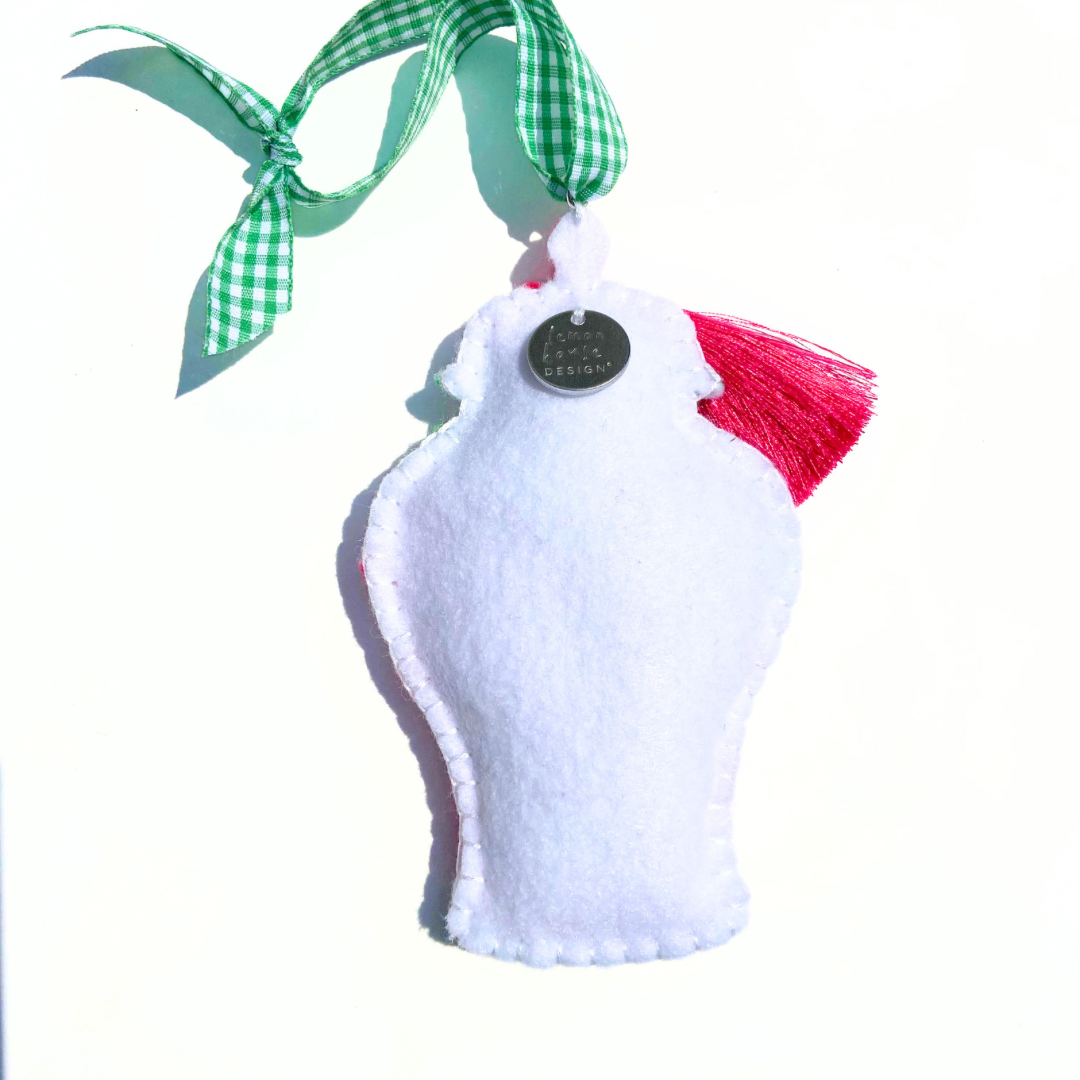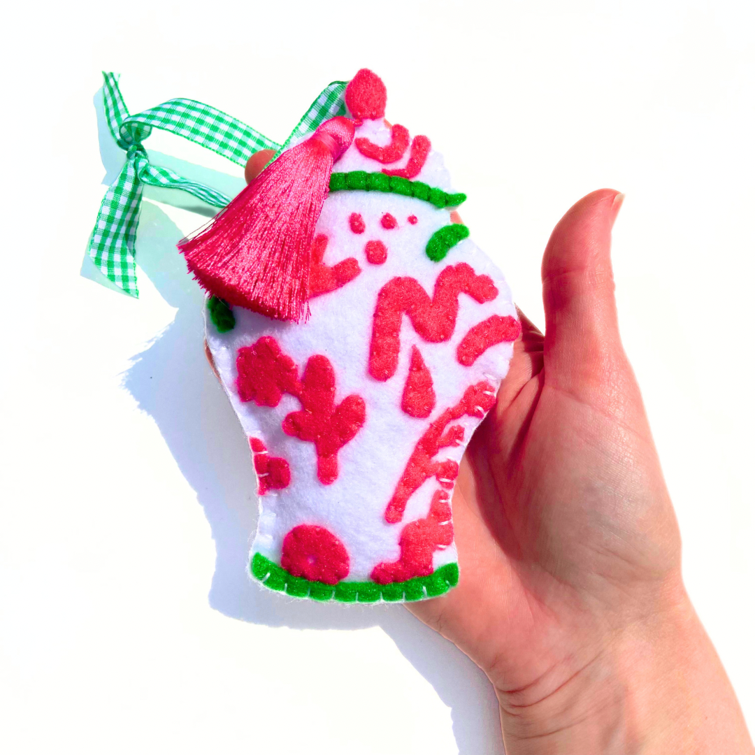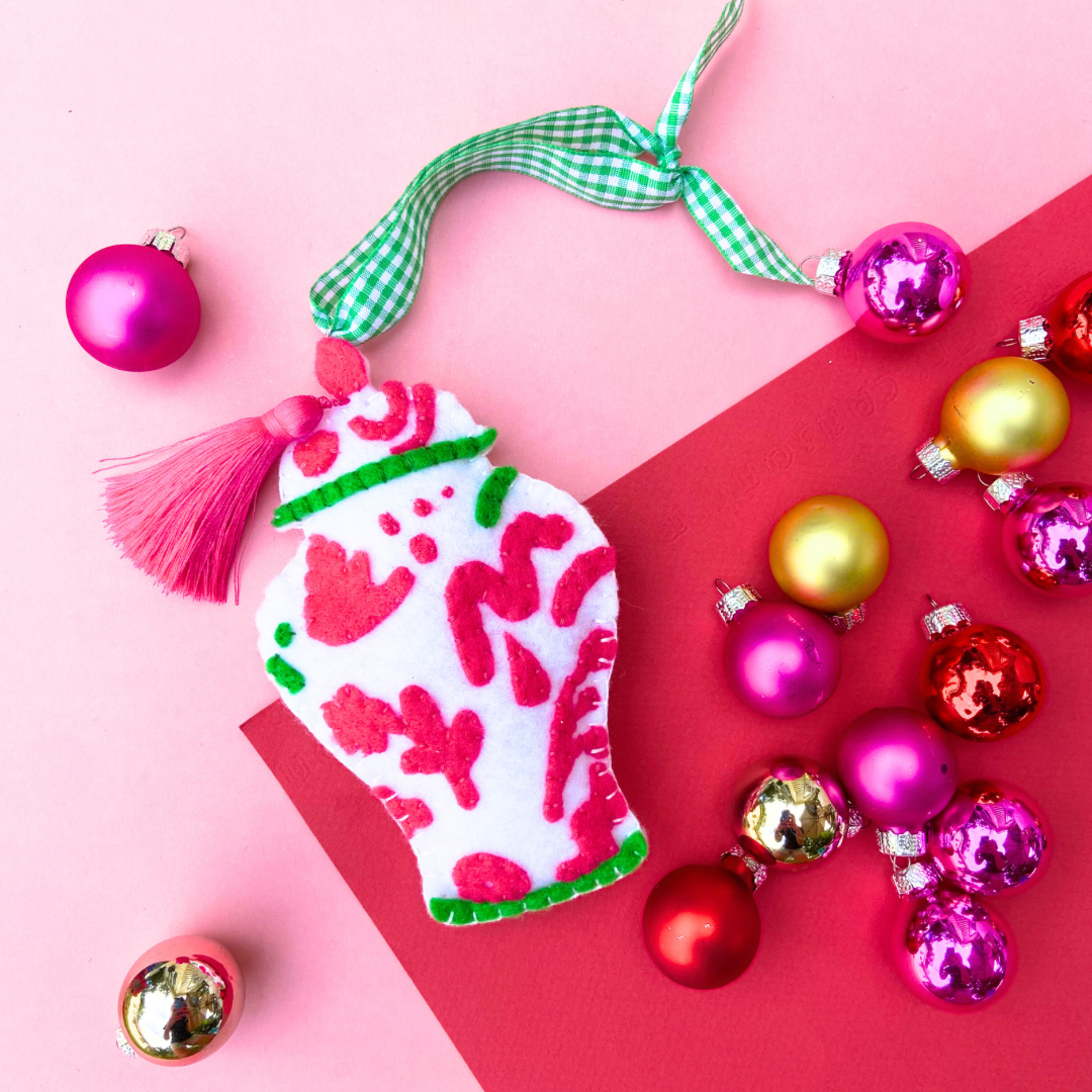 Delightful and bright, these ginger jars will leave your Christmas tree tickled pink. Crafted by hand in Annapolis, MD studio, these felt ornaments are accented with vivid kelly green for the ultimate pop of prep. -In Stock. -Size: 3.5"W x 5.75"H. Gingham ribbon loop for easy hanging.