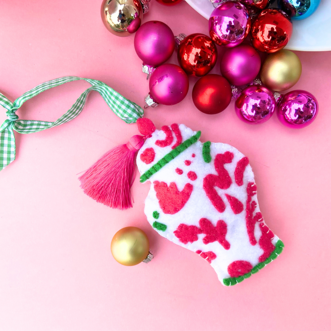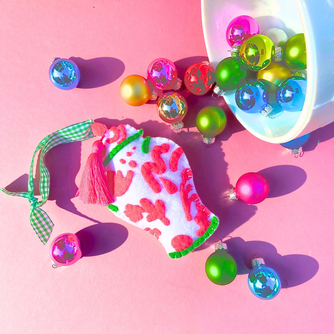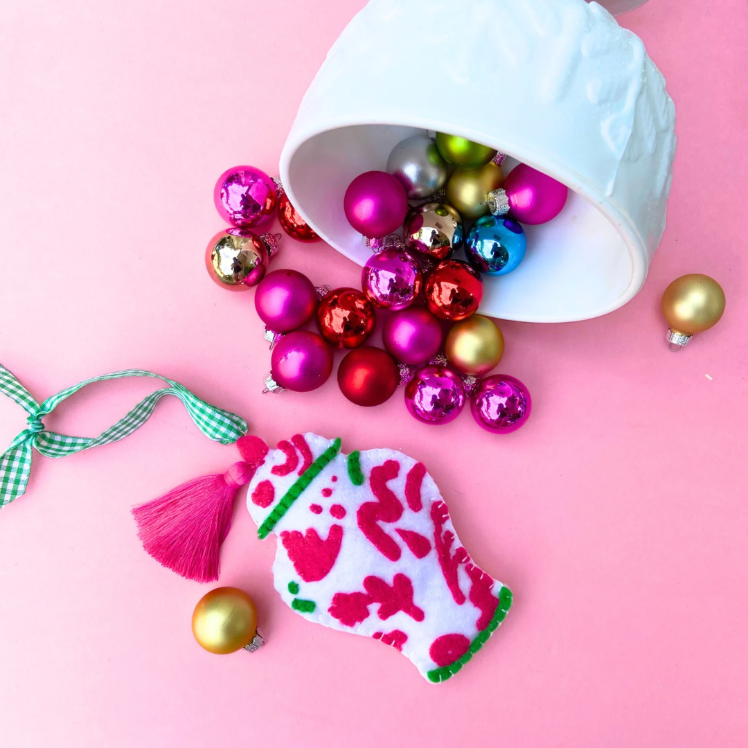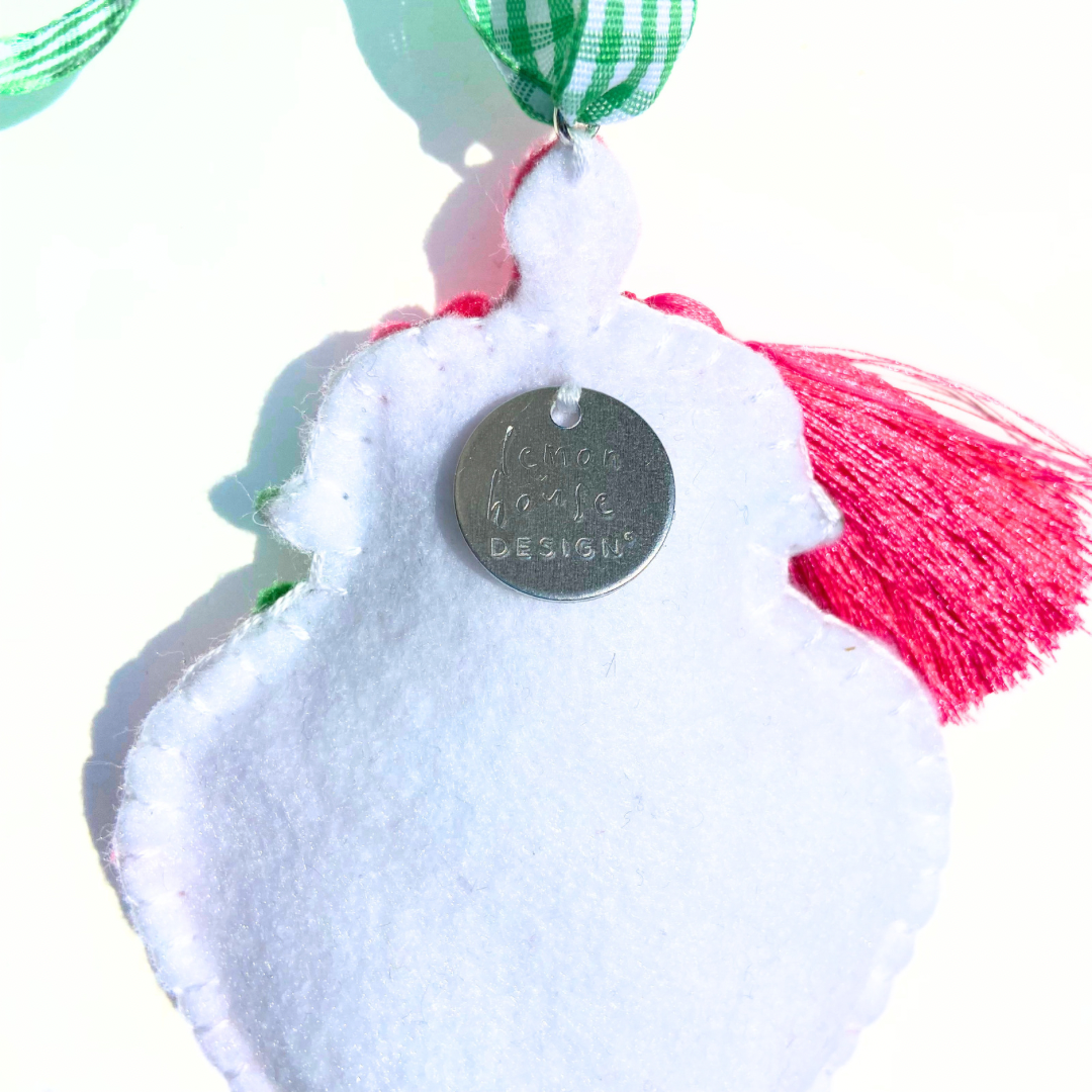Delightful and bright, these ginger jars will leave your Christmas tree tickled pink. Crafted by hand in Annapolis, MD studio, these felt ornaments are accented with vivid kelly green for the ultimate pop of prep. -In Stock. -Size: 3.5"W x 5.75"H. Gingham ribbon loop for easy hanging.