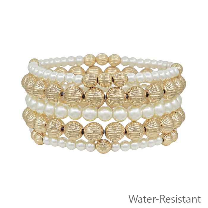 Set of 5 8MM Gold Beaded and Pearl Stretch Bracelets