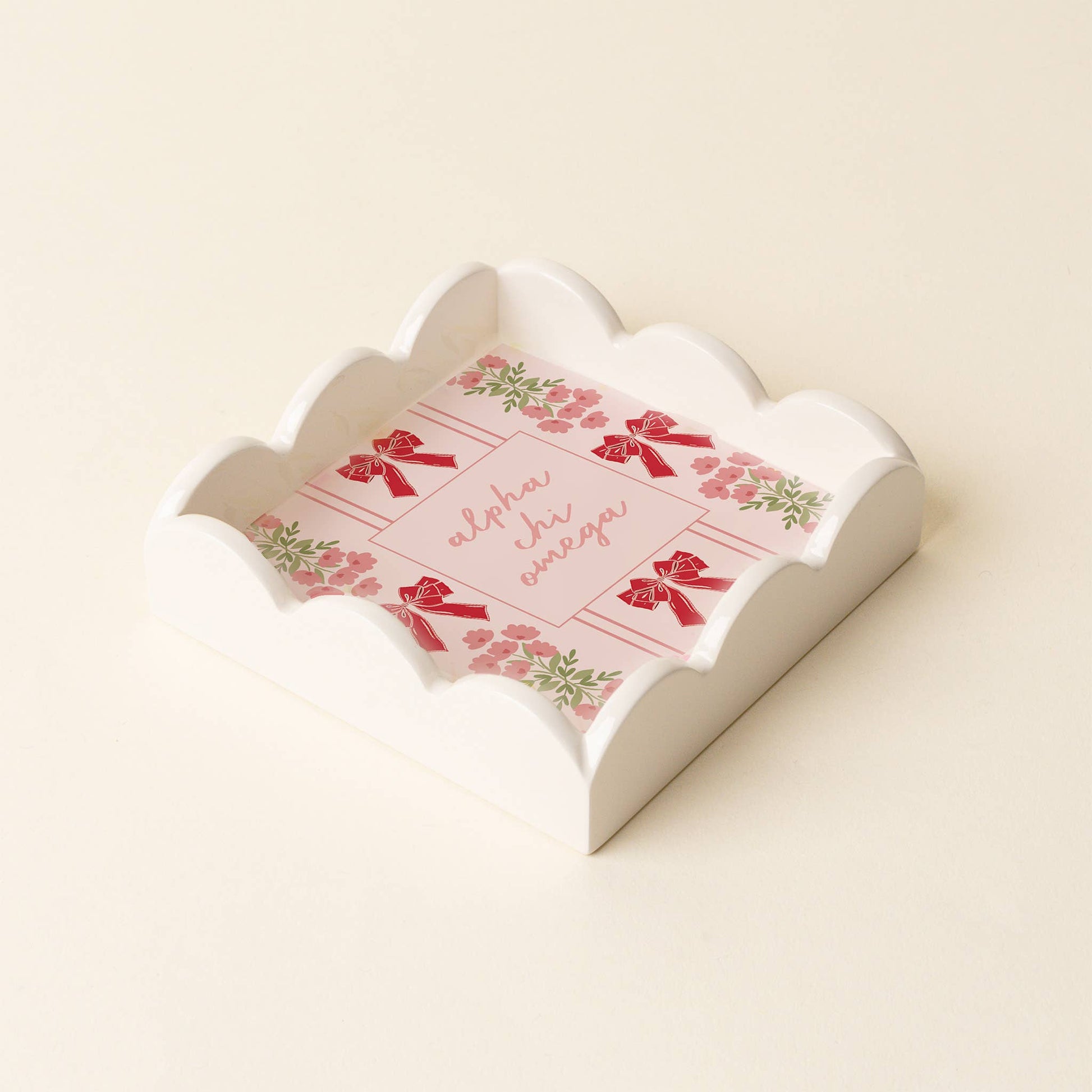 Keep your favorite rings, earrings, and other small treasures organized with the Sorority Scallop Trinket Tray. Designed with a charming scalloped edge and a playful sorority vibe, this tray adds a touch of personality to your vanity or desk. Its compact size makes it perfect for storing everyday essentials while showcasing your sisterhood pride.
