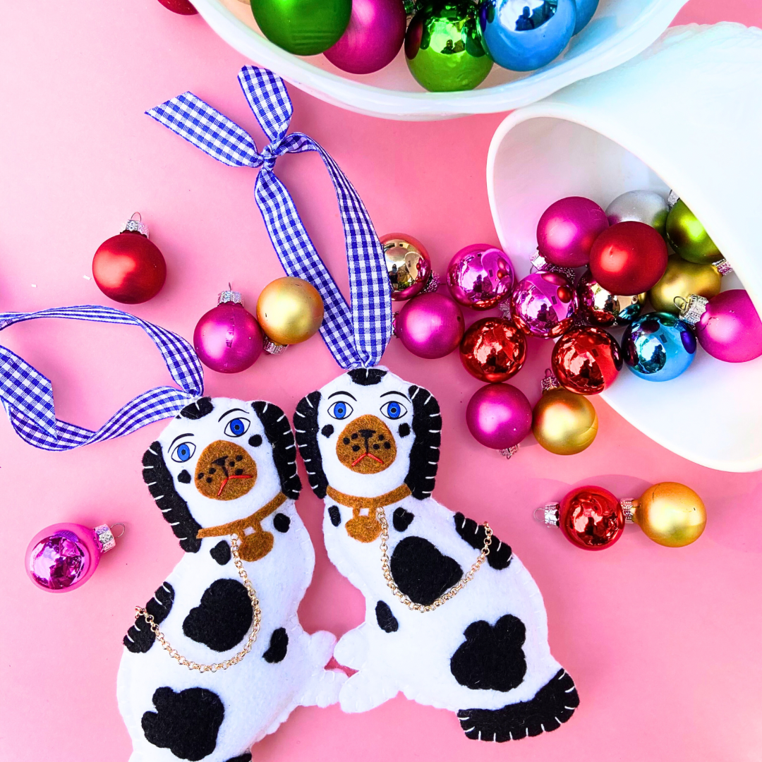 A new take on an old favorite, these hand-sewn felt Staffordshire dog statue ornaments are the perfect addition to any grandmillennial's Christmas collection. Complete with chain leash and a hint of gingham for good measure! Ornament Size: 4"W x 6.5"H. Gingham ribbon loop for easy hanging.