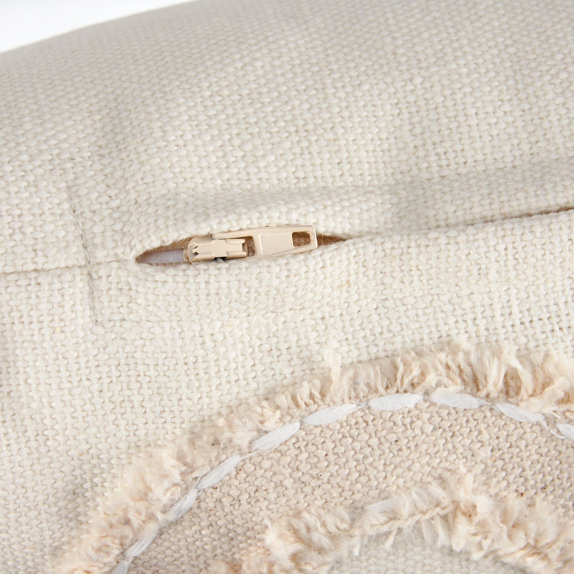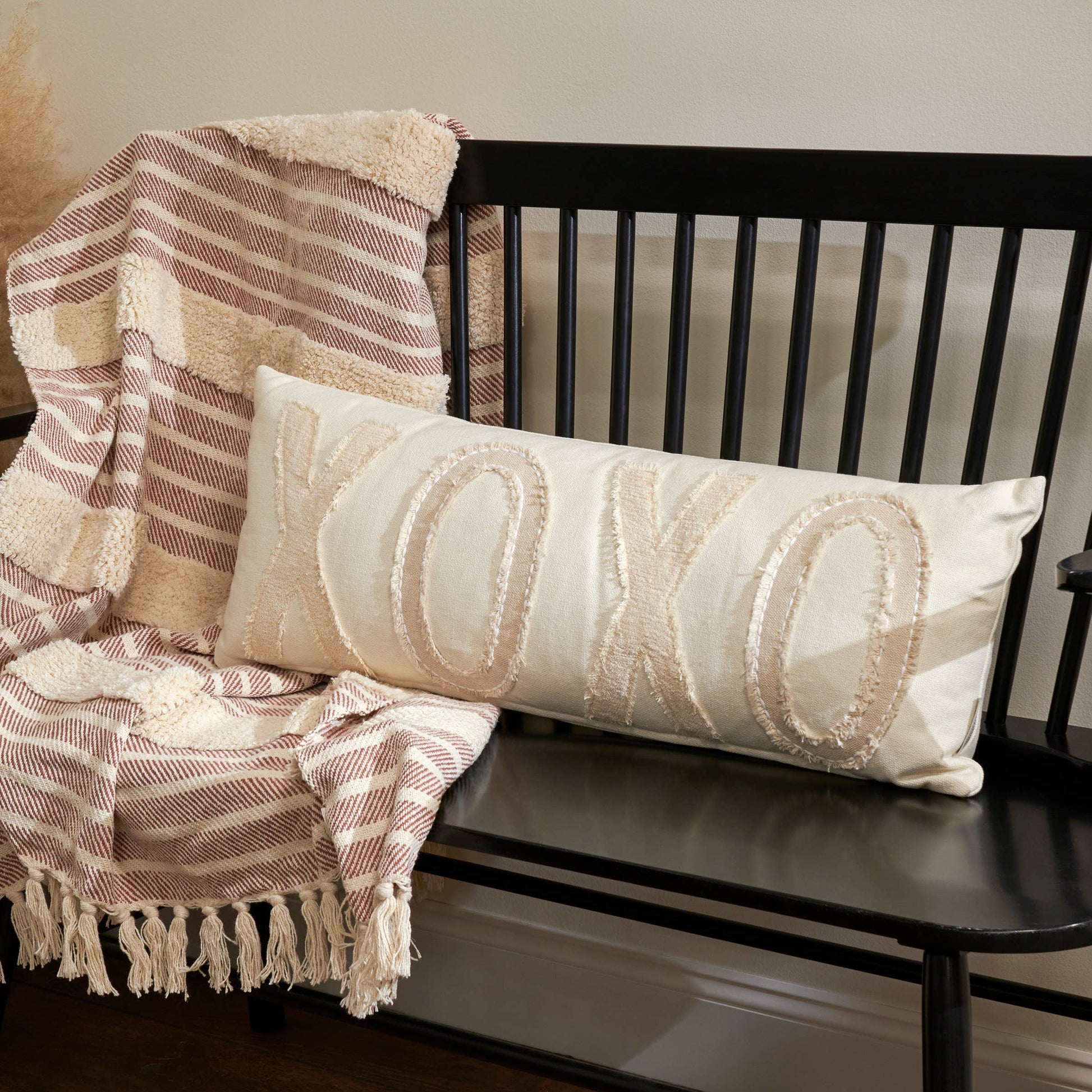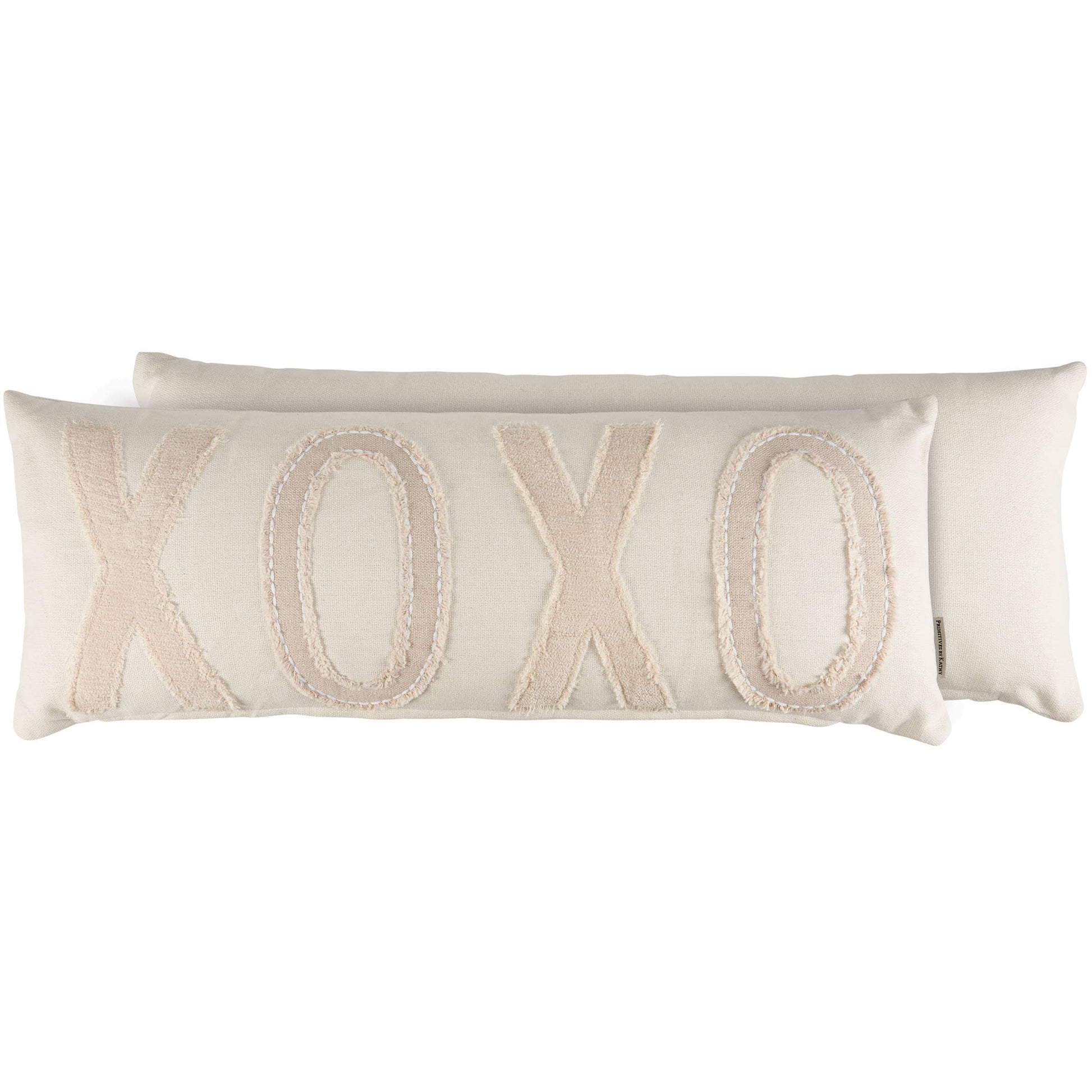 A decorative cream cotton pillow from our Valentine's Day Collection displaying subtle textured XOXO design with embroidered stitch accents in a neutral color palette. Our XOXO pillow includes a zipper to easily remove and clean machine-washable pillow cover. Pillow contains polyester filling and is shipped vacuum-sealed for protection and storage. A rustic seasonal home accent that coordinates with a variety of décor.